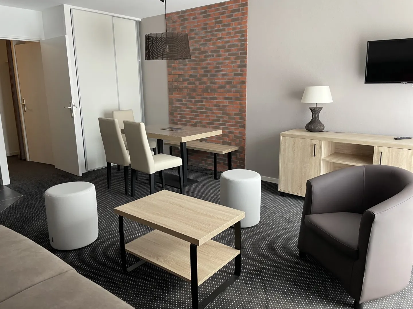 Salón: sofá cama doble de 160 cm, televisión.