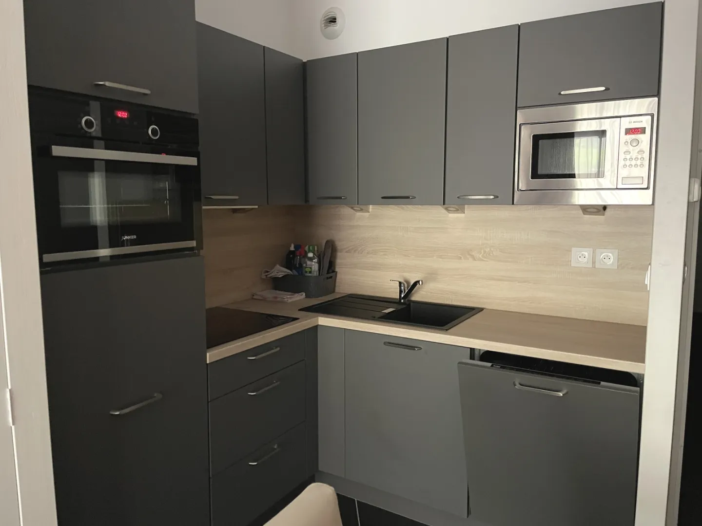 Cocina americana: frigorífico con congelador, placa vitrocerámica de 4 fuegos, horno, microondas, lavavajillas, cafetera de filtro, tostadora, hervidor, robot de cocina.