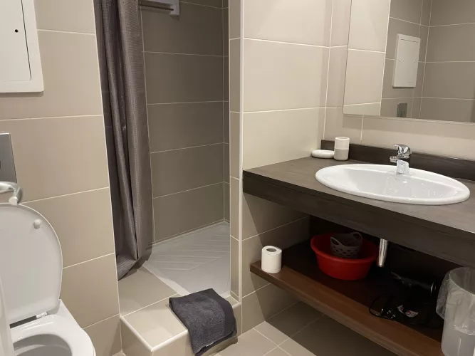 Cuarto de baño: lavabo, ducha, WC y secador de pelo.