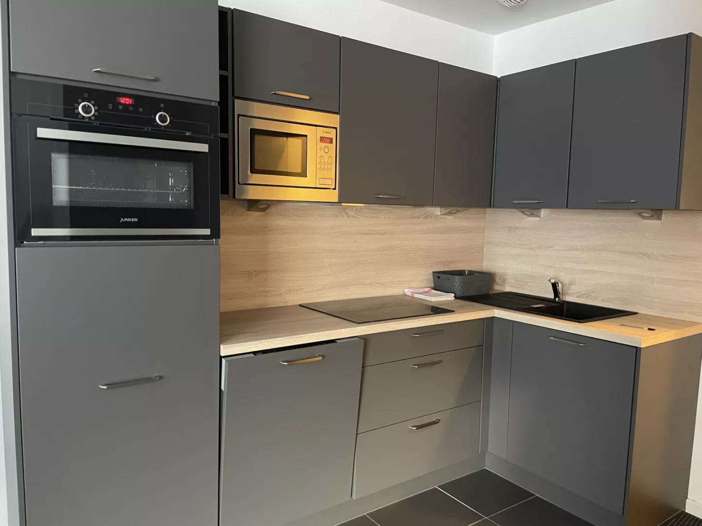 Cocina americana: frigorífico con congelador, placa vitrocerámica de 4 fuegos, horno, microondas, lavavajillas, cafetera de filtro, tostadora, hervidor, robot de cocina.