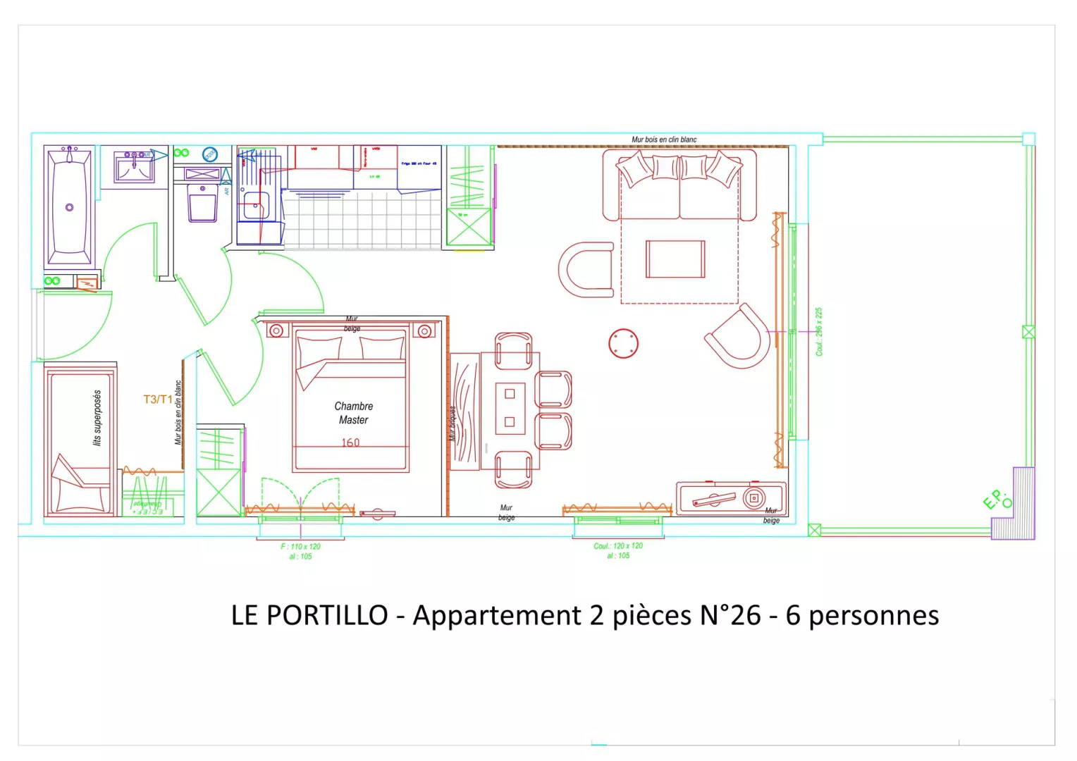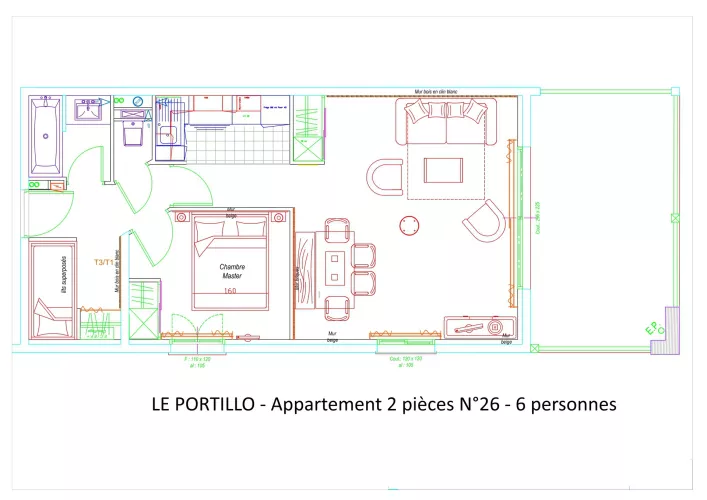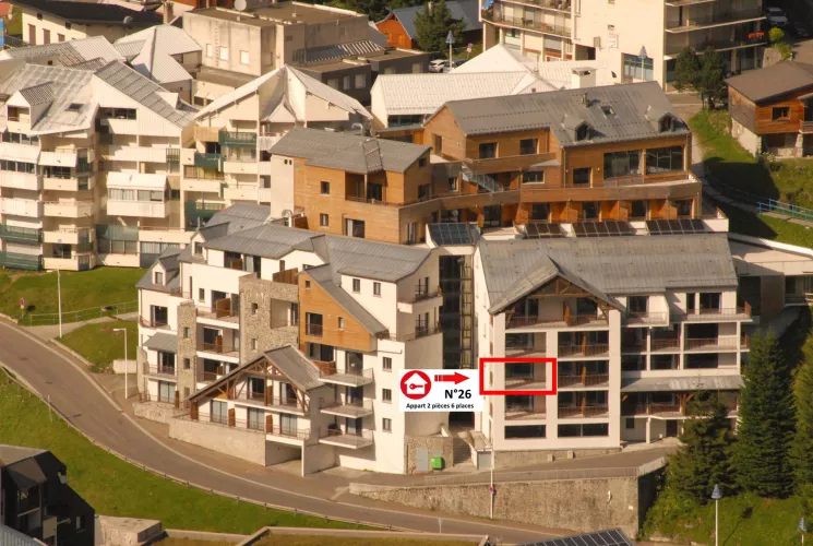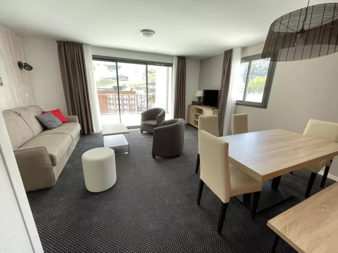 Residencia LE PORTILLO con piscina, apartamento de 2 habitaciones para 6 personas, de 49 m², orientación suroeste, vistas a las pistas y a la montaña, situado en la 2.ª planta con terraza.