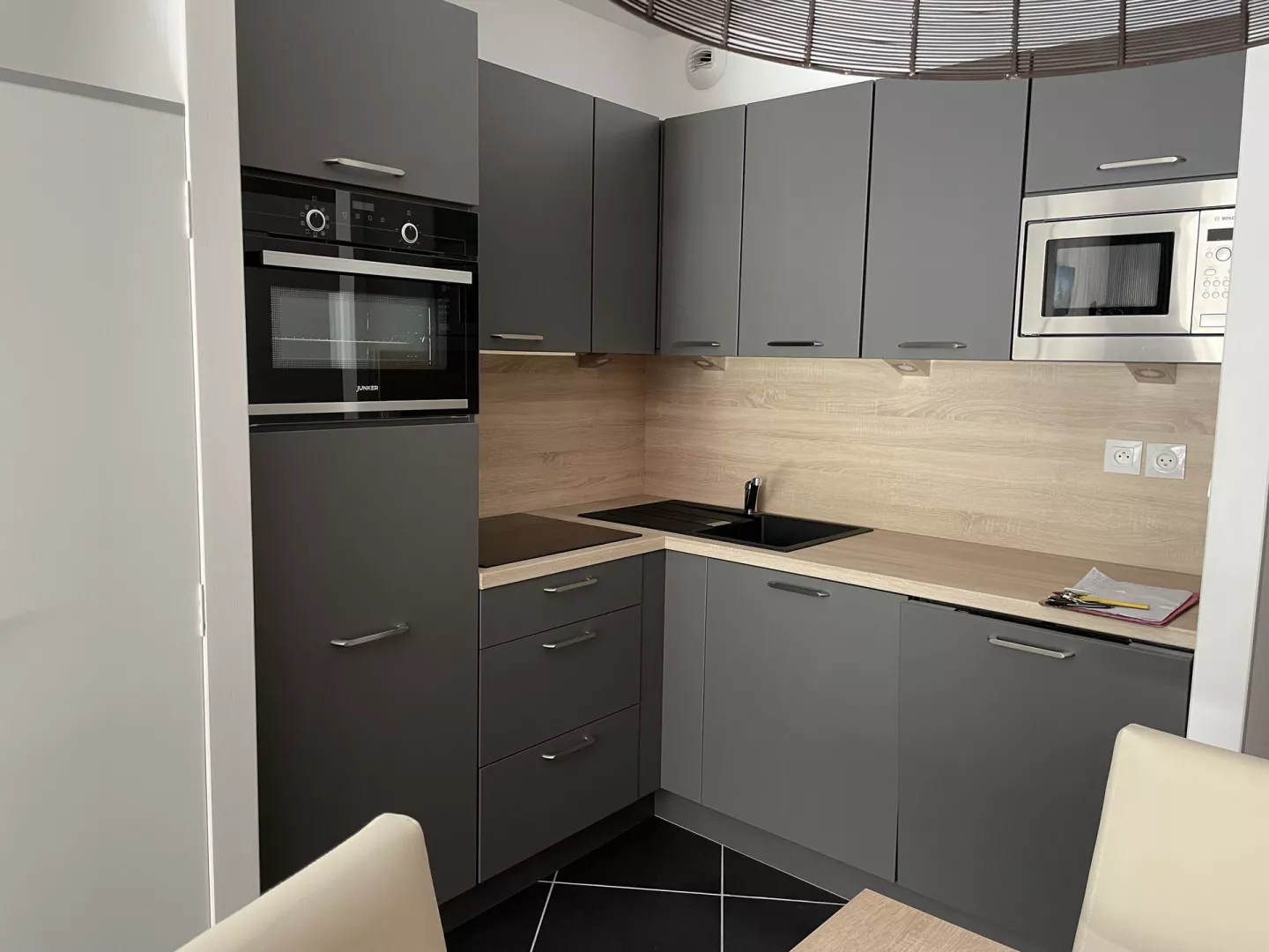 Cocina americana: frigorífico con congelador, placa vitrocerámica de 4 fuegos, horno, microondas, lavavajillas, cafetera de filtro, tostadora, hervidor, robot de cocina.