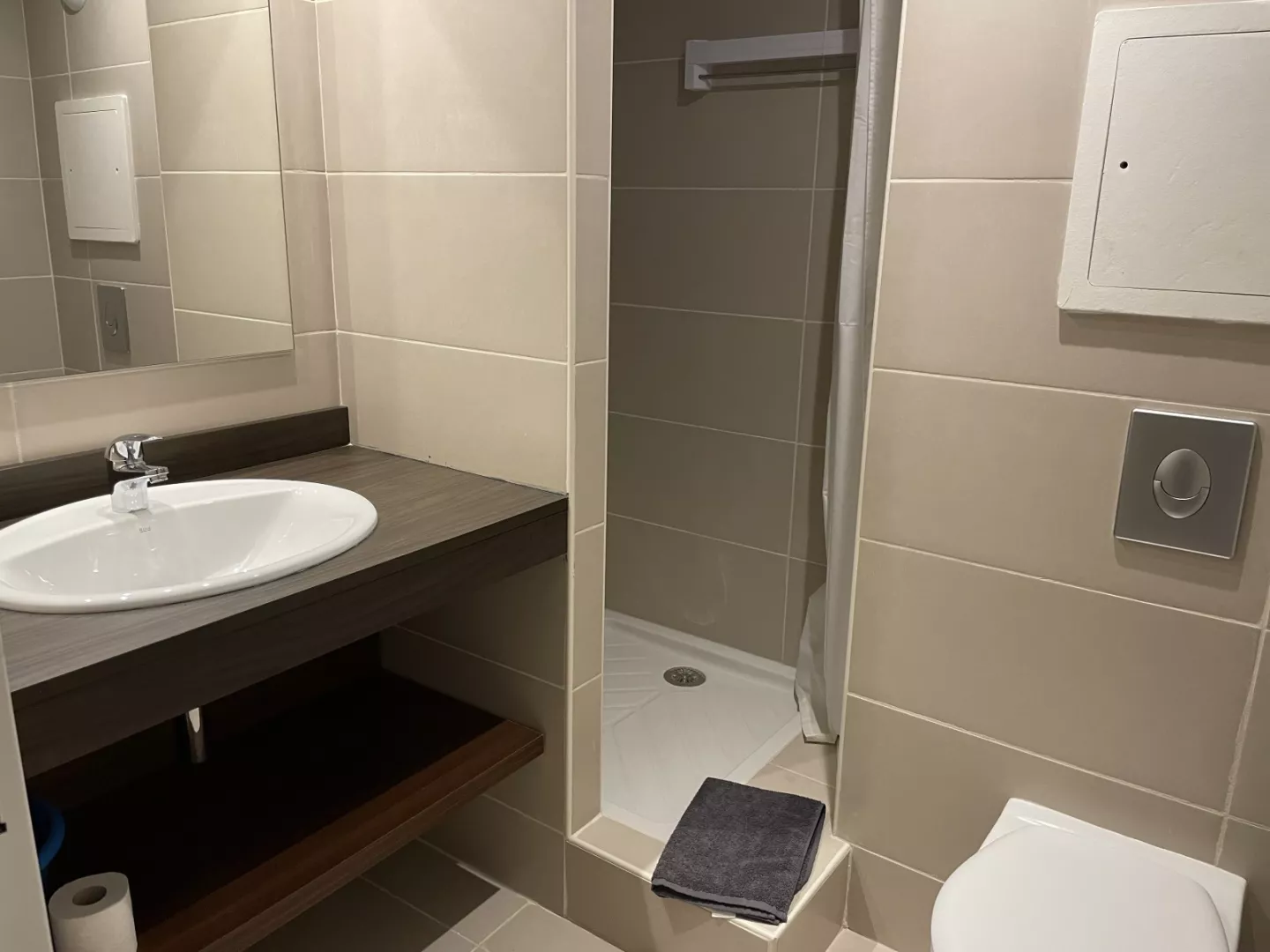 Cuarto de baño: lavabo, ducha, WC y secador de pelo.