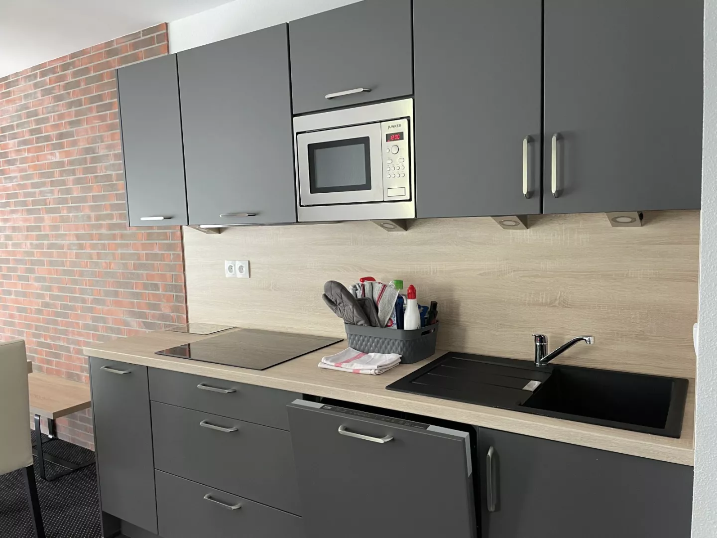 Cocina americana: frigorífico con congelador, placa vitrocerámica de 4 fuegos, horno, microondas, lavavajillas, cafetera de filtro, tostadora, robot de cocina.