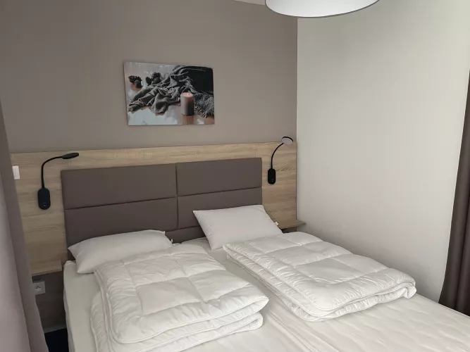 Habitación 1: cama de 160 cm, televisión y cuarto de baño: ducha y lavabo.