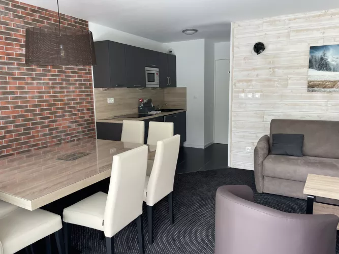 Idealmente situado en el centro de la estación. Comercios 100 m y pistas a 150m.