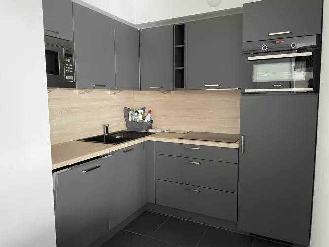 Cocina americana: frigorífico con congelador, placa vitrocerámica de 4 fuegos, horno, microondas, lavavajillas, cafetera de filtro, tostadora, robot de cocina.