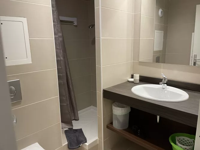 Cuarto de baño: lavabo, ducha, WC y secador de pelo.