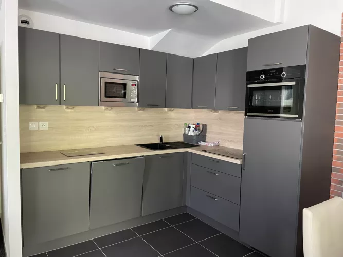 Cocina americana: frigorífico con congelador, placa vitrocerámica de 4 fuegos, horno, microondas, lavavajillas, cafetera de filtro, tostadora, hervidor, robot de cocina.