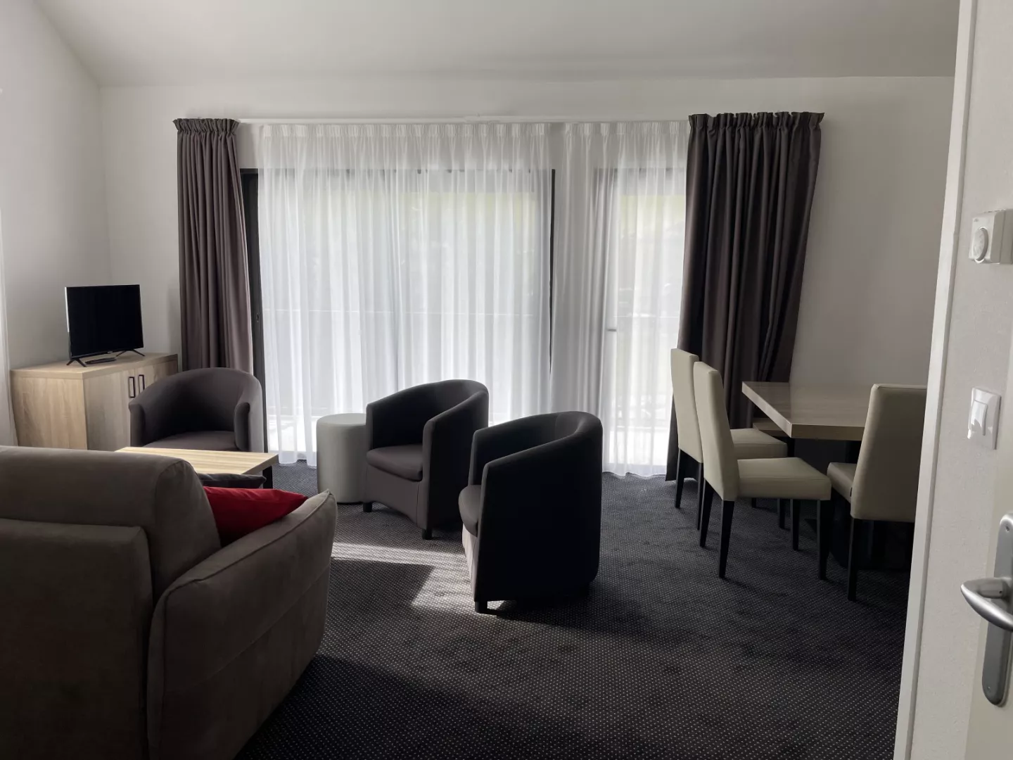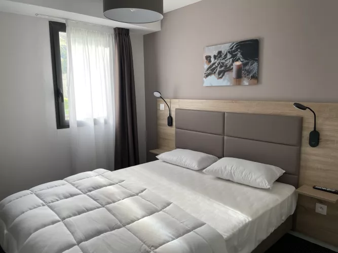 Habitación 1: cama de 160 cm, televisión y cuarto de baño: ducha, lavabo y WC.