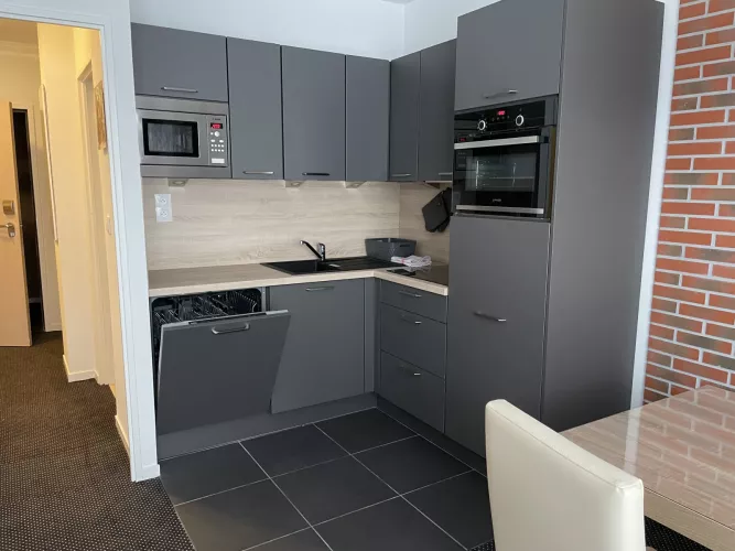 Cocina americana: frigorífico con congelador, placa vitrocerámica de 4 fuegos, horno, microondas, lavavajillas, cafetera de filtro, tostadora, hervidor y robot de cocina.