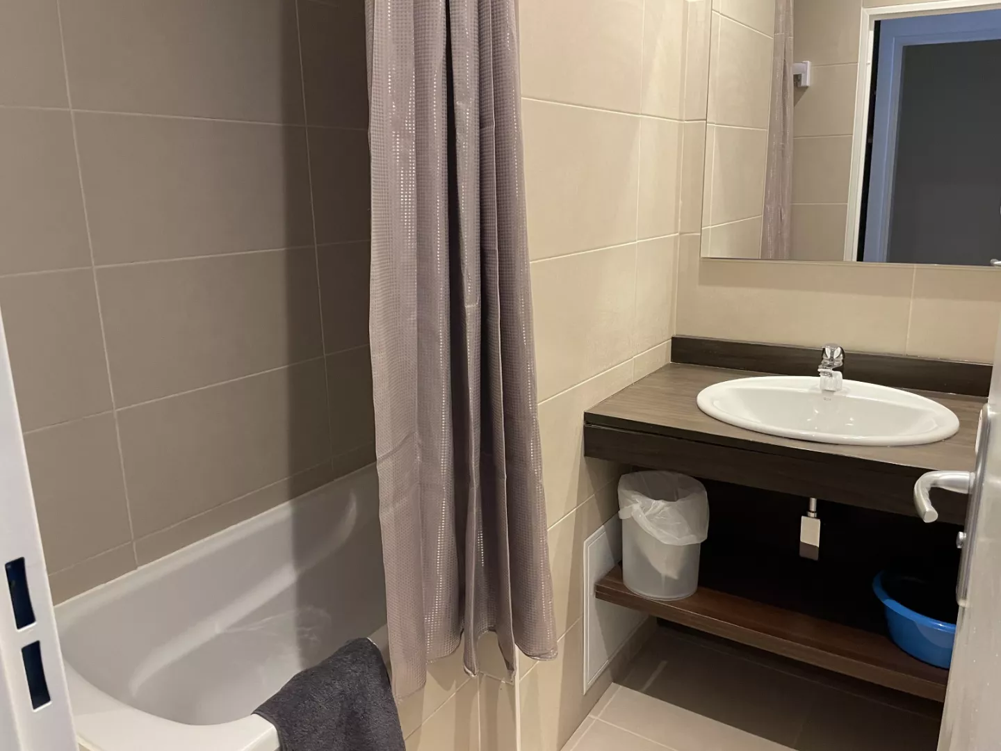 Cuarto de baño: lavabo, bañera y secador de pelo.