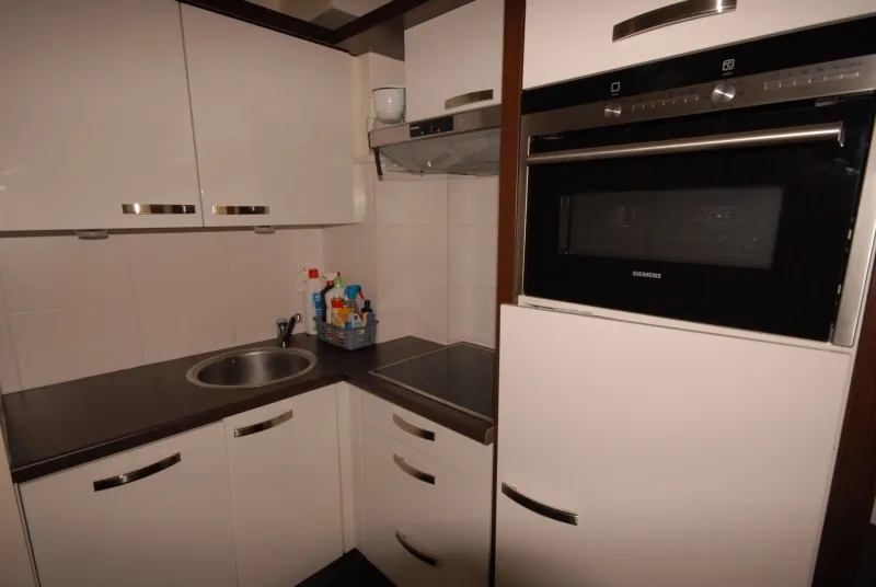 Rincón cocina: placa vitrocerámica de 4 fuegos eléctricos, microondas combinado, lavavajillas, frigorífico con congelador, cafetera de filtro.