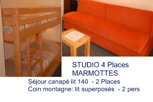 Residencia LES MARMOTTES, estudio confortable equipado y amueblado para 4 personas, planta 1 sin ascensor, vistas a las pistas, 24 m², orientación sureste, calefacción eléctrica.