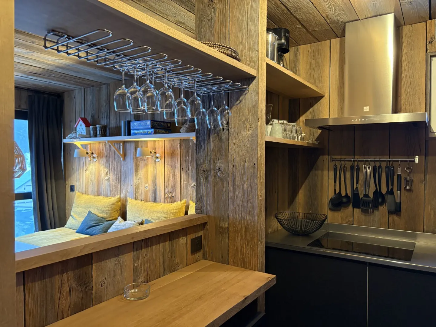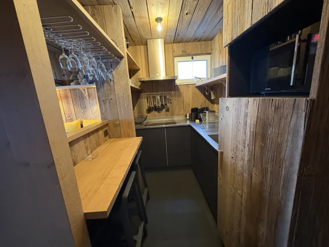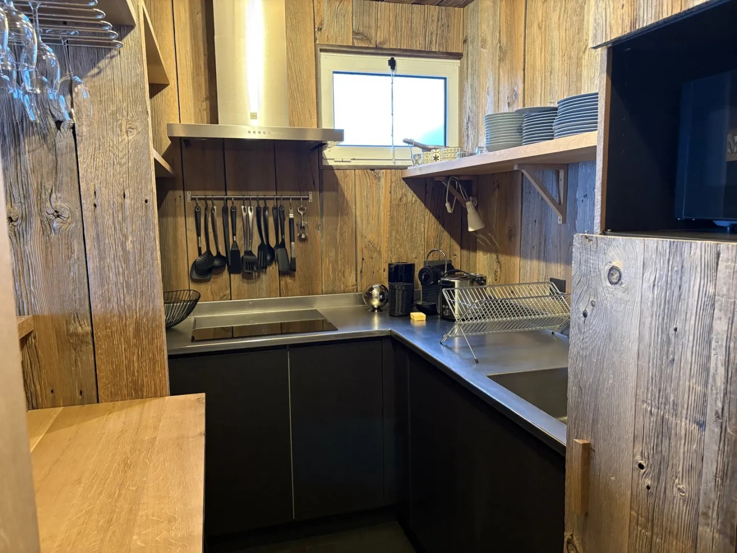 Espace cuisine : plaque vitro 4 feux, micro-ondes grill, frigo avec bac conservateur, lave vaisselle, cafetière Nexpresso, grille-pain.
