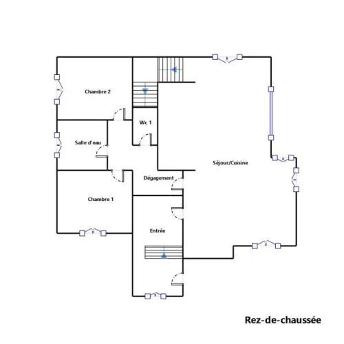 Planta baja (nivel principal): amplio salón diáfano con cocina y salón con chimenea, dos dormitorios, un baño y un aseo.